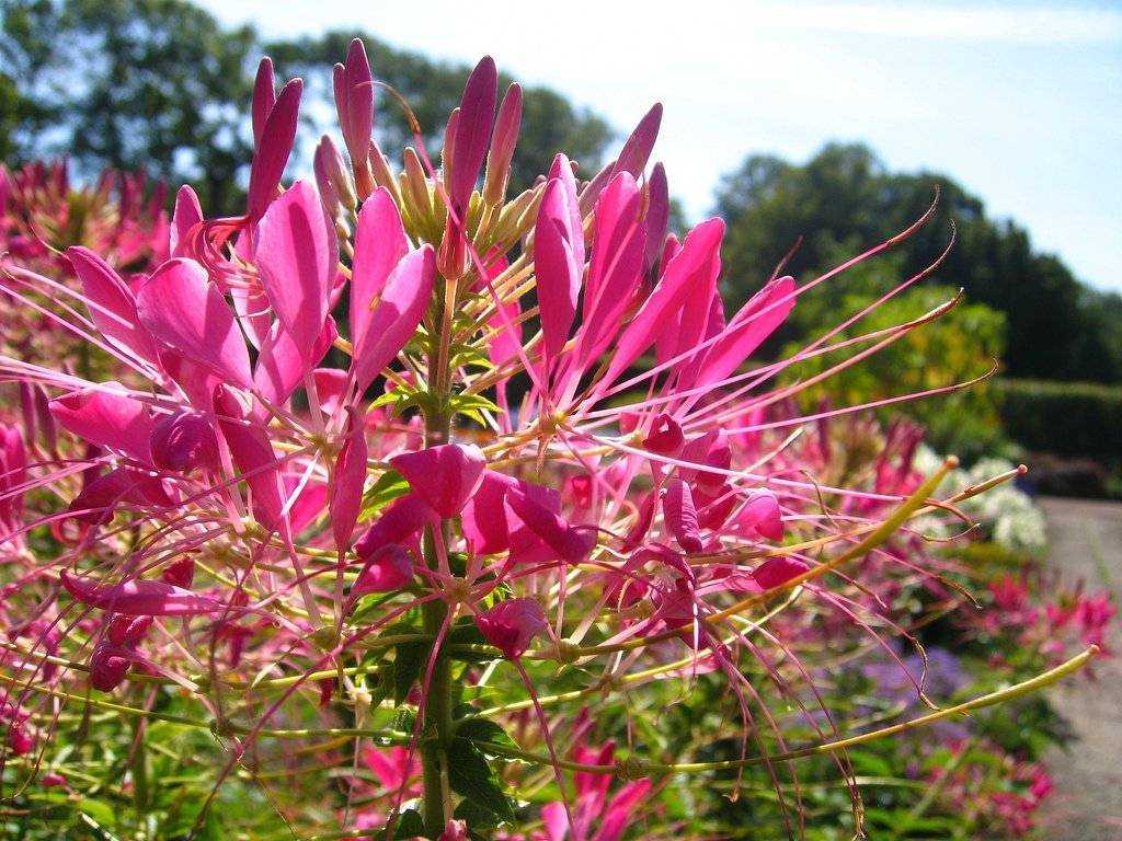 В роду клеомы зарегистрировано около 170 видов растений, однако в отечественных цветочных магазинах пока встречается только клеома колючая. Этот полукустарник родом из Южной Америки. В России он выращивается в качестве однолетней культуры. Растение отличается длинными стеблями с острыми колючками у основания листьев. На цветоносе длиной 60-80 см располагается шарообразное соцветие. Небольшие цветы розового или пурпурного цвета имеют длинные тычинки, напоминающие паучьи лапки. За них клеому часто величают «паучником». Над тычинками располагается 4 яйцевидных лепестка в форме веера.