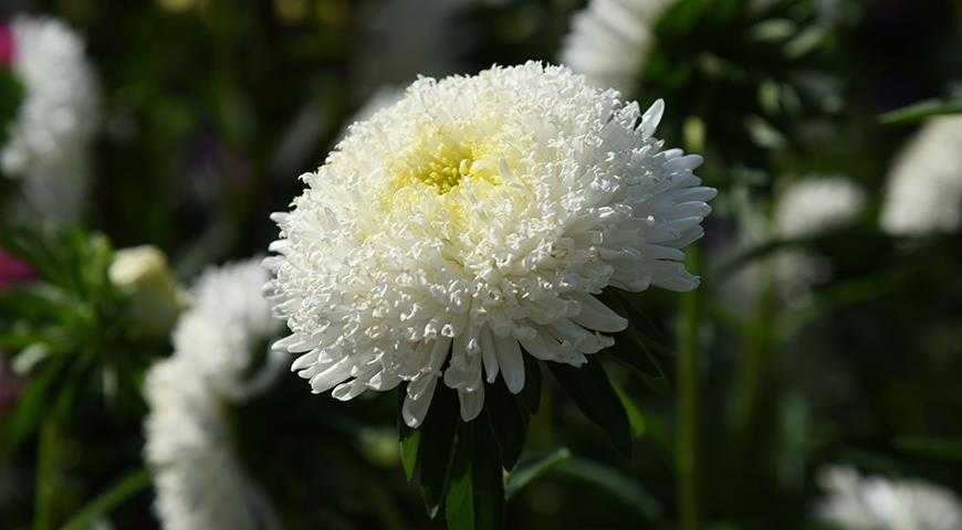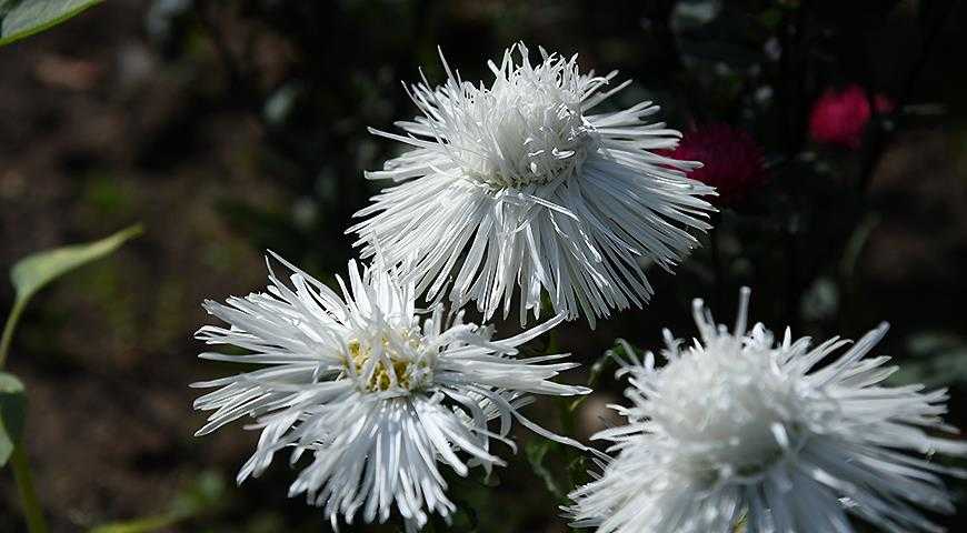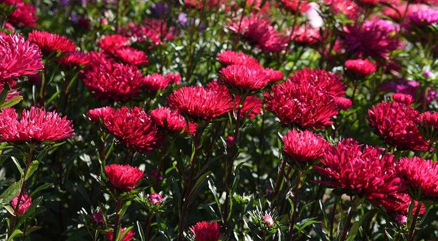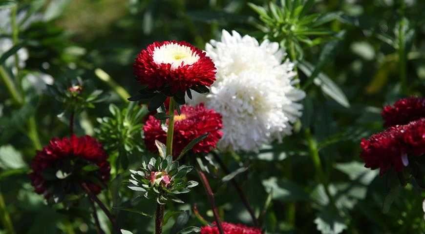 Самые распространенные сорта астр: белая Альба, светло-лиловый Голиаф, темно-фиолетовый Дункле Шене, розово-красный Рубер.
