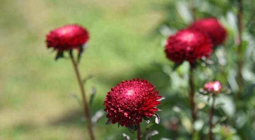 Распространенные сорта астр: голубой Сатурн, голубой полумахровый Октоберфест, пурпурно-красный Бричвуд Райел, темно-лиловый полумахровый Аметист.