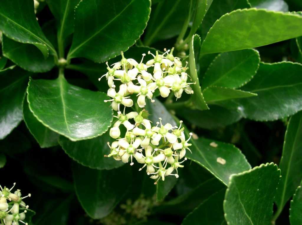 - бересклет японский, или псевдолавр – очень теплолюбивое растение, способное погибнуть при температуре ниже +5 градусов, поэтому его можно выращивать только в домашних условиях или в офисах. Листья у него могут быть пестрыми, или одноцветные, цветки белые, расцветающие в конце весны.