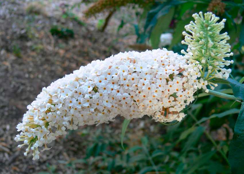 Белоцветковая. Этот вид будлеи произрастает в Японии. Там кустарник вырастает до 6 м. В России редко он превосходит значение в 3 м. Отличается растение большими соцветиями, длина которых составляет почти полметра. В настоящее время выведены похожие сорта, но не с белыми, а цветными цветками.