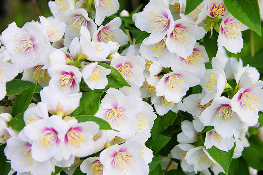 Главное достоинство Венечного чубушника – розовое пятно в середине цветка, цветки обычно немахровые, но крупные и с сильным ароматом.