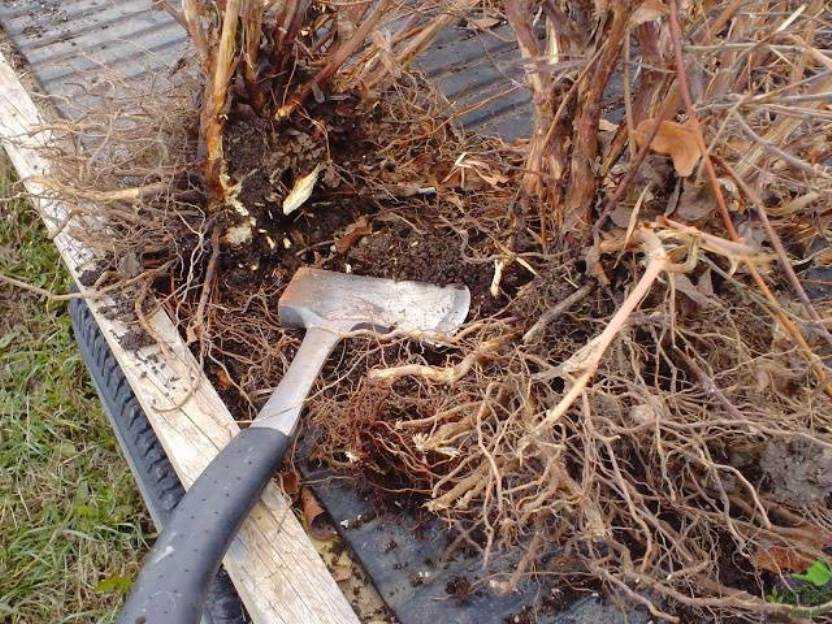 - Выбрать куст возрастом 5-6 лет. У растений старше 6 лет будет трудно разделить корневой ком.