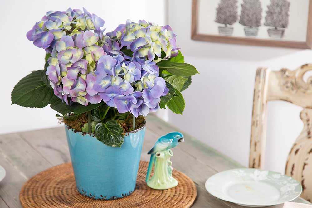 Природная гамма комнатных гортензий включает белый, розовый, пурпурные и голубой спектры в самых мягких, пастельных вариациях.
