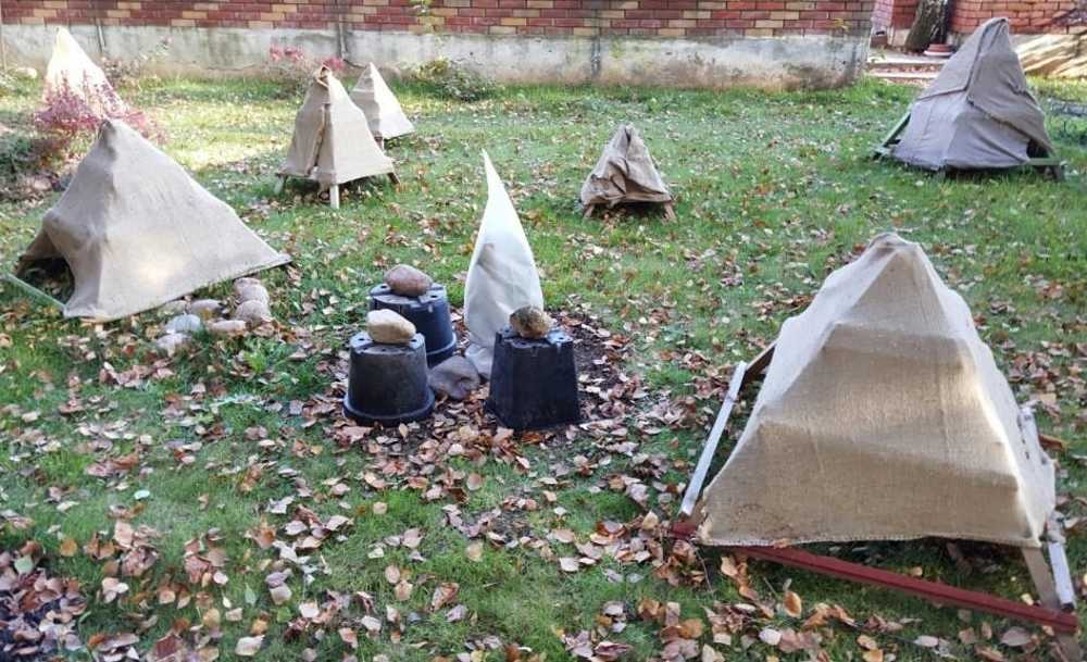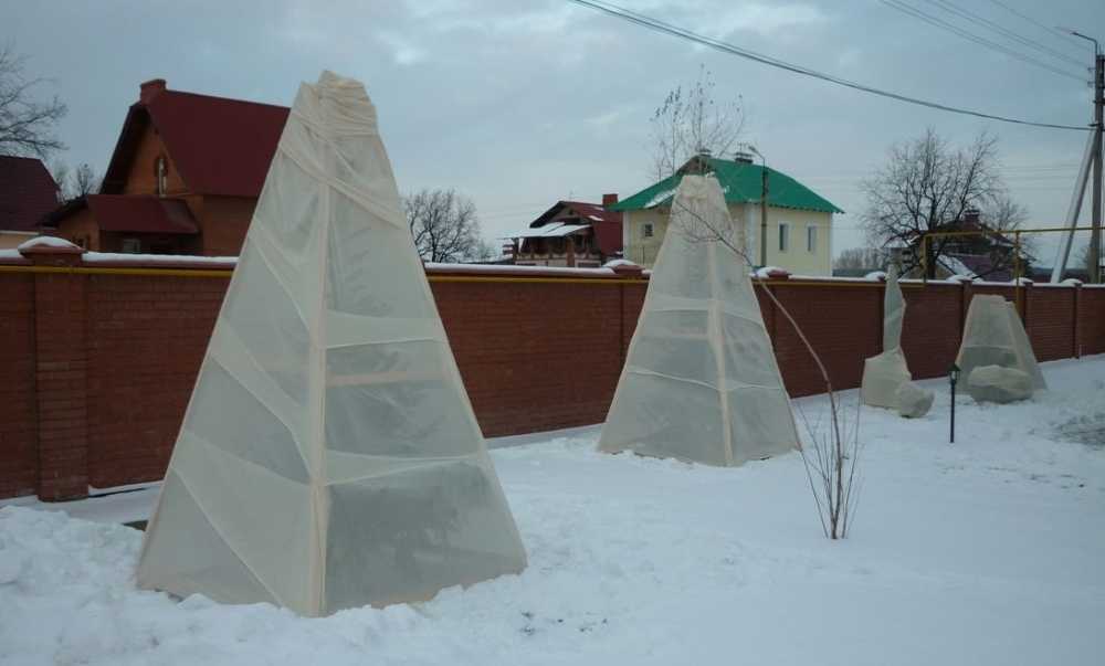 - Накрыть кустики деревянными или сетчатыми коробами, внутреннее пространство которых заполнить сухой листвой или опилками. Затем конструкцию обмотать укрывным материалом и хорошо зафиксировать его.