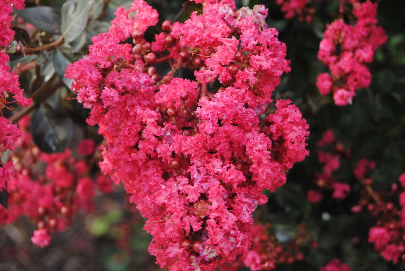 Цветы уступают место круглым семенным капсулам, которые часто сохраняются в течение зимы. Гладкая бледно-розовато-серая кора на зрелых ветвях отслаивается с возрастом. Там, где зимние травмы могут быть проблемой, растения обычно вырастают до 1,2 м в высоту. На глубоком юге растения вырастут намного выше, если их не обрезать весной. Растения обычных видов не продаются. За эти годы было введено множество сортов от карликовых до размеров деревьев, многие из которых гибриды между видами L. Indica и L. Faueri.