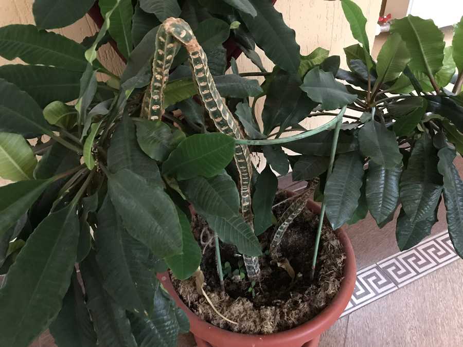 - Болезни, вредители. При ненадлежащем содержании растений, они теряют внешнюю привлекательность, желтеют, сбрасывают листья, могут погибнуть. Поэтому уход за представителями семейства молочайных необходимо тщательно выполнять, следить за тем, чтобы не завелись вредители (паутинный клещ, корневой и мучнистый червец, тля). Корневых вредителей уничтожают при пересадке растения путём смывания водой (температура — +45°С) и последующей обработкой грунта препаратом Актара. Клещей, тлю собирают вручную с последующей обработкой листьев и стебля раствором хозяйственного мыла. В особо запущенных ситуациях, применяют инсектициды, например, Фитоверма.