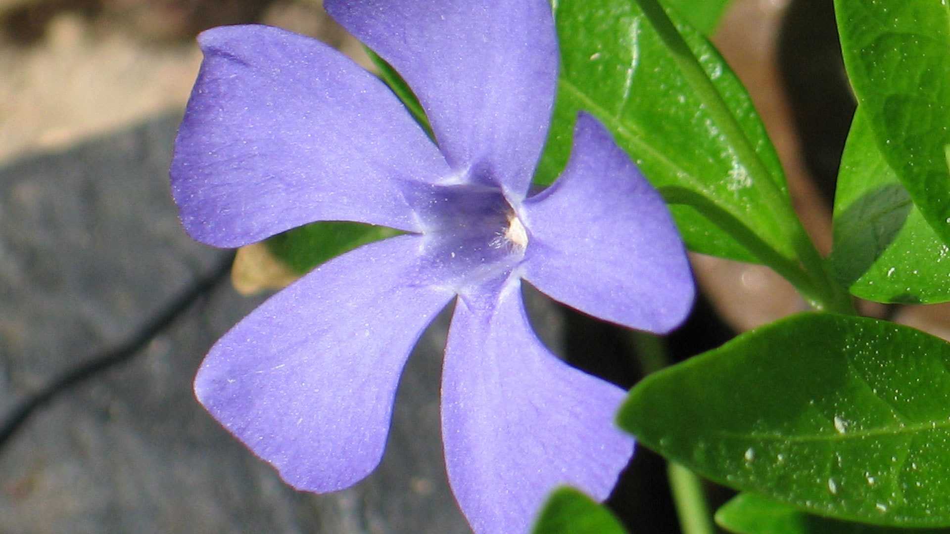 Барвинок – вечнозеленый многолетник, покрывающий ярким ковром клумбы, рабатки, склоны. Неприхотливый в уходе, этот цветок одинаково любим и опытными дизайнерами ландшафта и начинающими садоводами. Листья растения как будто покрыты восковым налетом, плотные и блестящие. Соцветие нежно-фиолетовых, нежно-синих оттенков состоит из пяти лепестков.