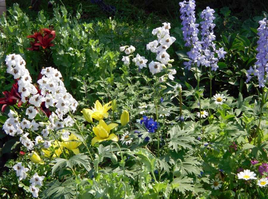 - Высота экземпляров. Формируйте участок так, чтобы высокорослые представители не затеняли низкорослых. Также учитывайте период цветения экземпляров флоры.