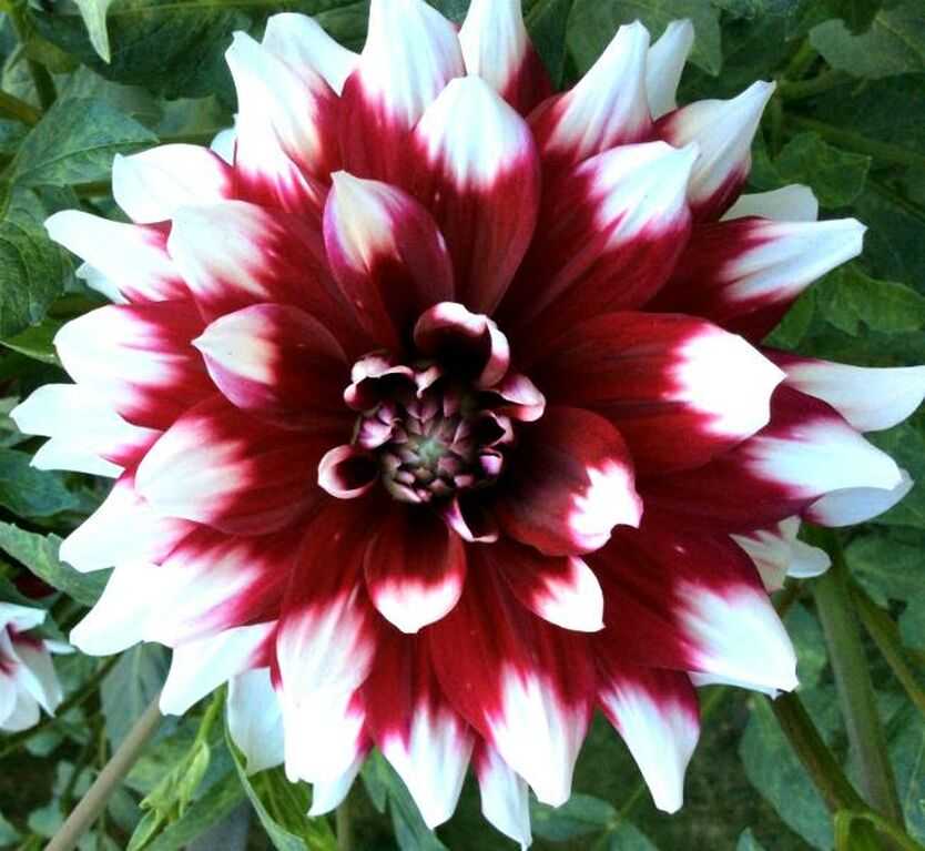Цветок махровый, бордового цвета, кончики лепестков белые. Лепестки плоские, с заостренным концом. Размер соцветия – до 20 см.