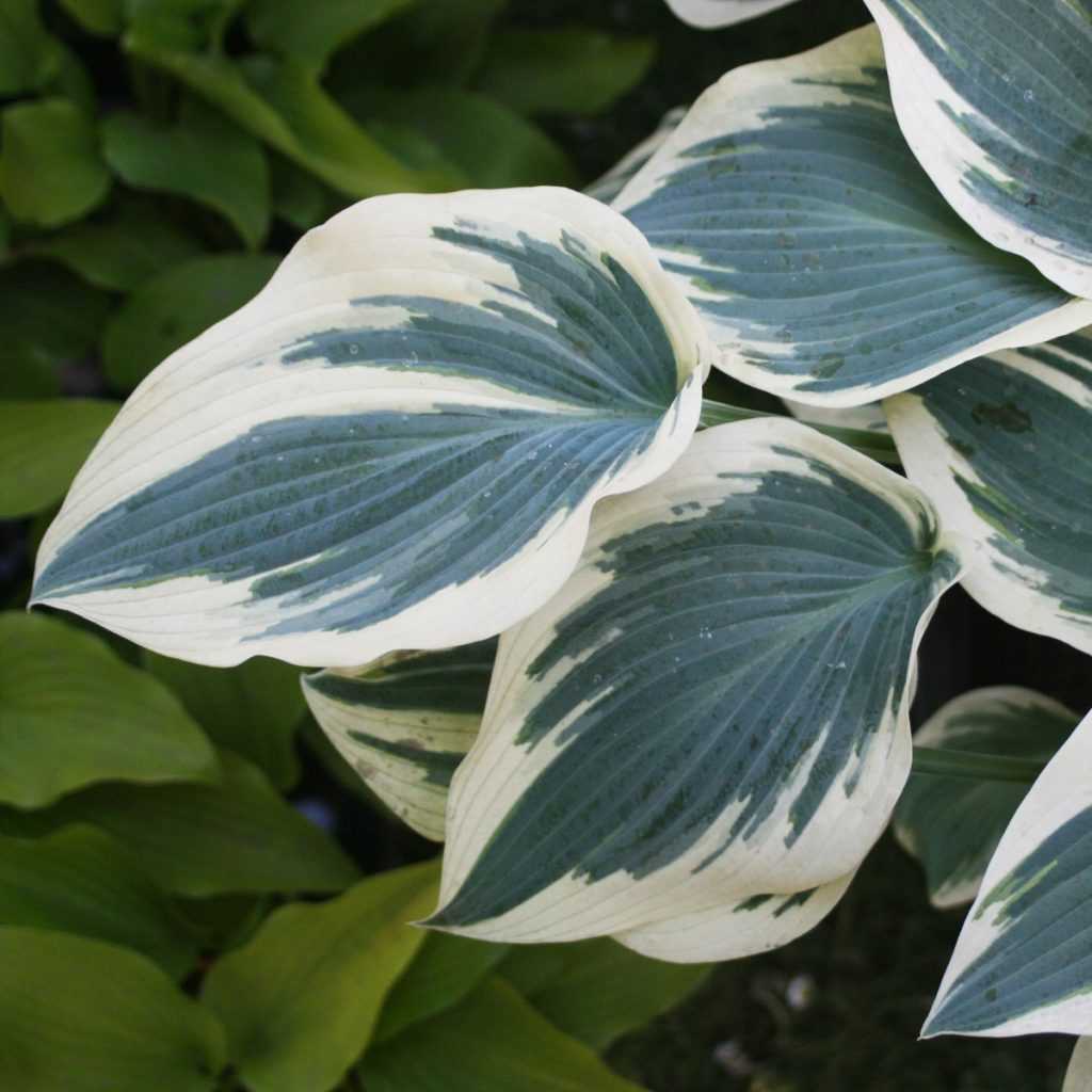 - Блу Айвори (BlueIvory) — декоративный сорт с голубоватыми листьями, обведенными сливочной каймой по краю. К осени эта полоса становится белоснежной. Блу Айвори тенелюбива и среднеросла (до 50 см в высоту). Лист толстый. Хорошо развивается на солнце и в ажурной тени. Предпочитает легкие, рыхлые, умеренно увлажненные почвы.