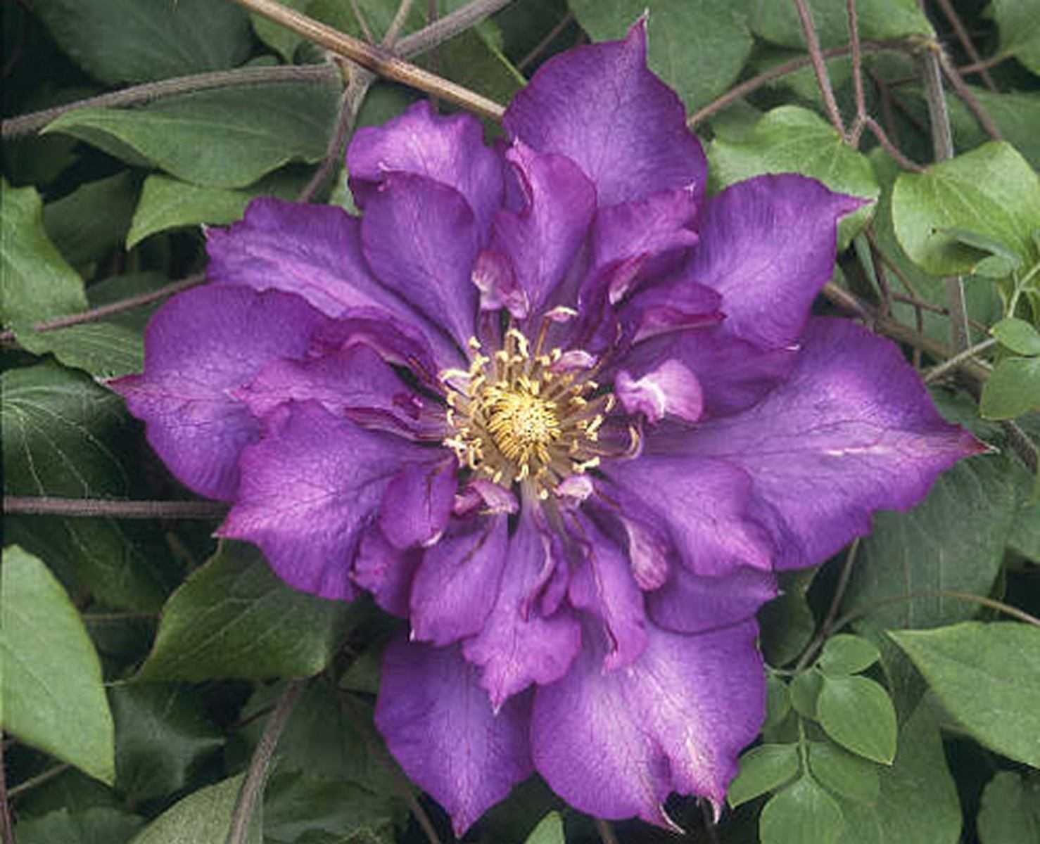 Первое цветение клематисов этой группы наступает в июне-июле, второе — в августе. Цветки сиреневого цвета диаметром до 16 см, осенью в центре лепестков проходит полоска темно-бордового цвета. Низкорослый сорт, около 2 м в высоту.