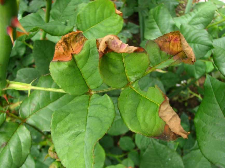 Коричневая кайма на листьях и ее распространение на центр пластины, усыхание листьев и верхней части побегов | Удаление наземной части куста, обработка почвы над корнями фунгицидами |