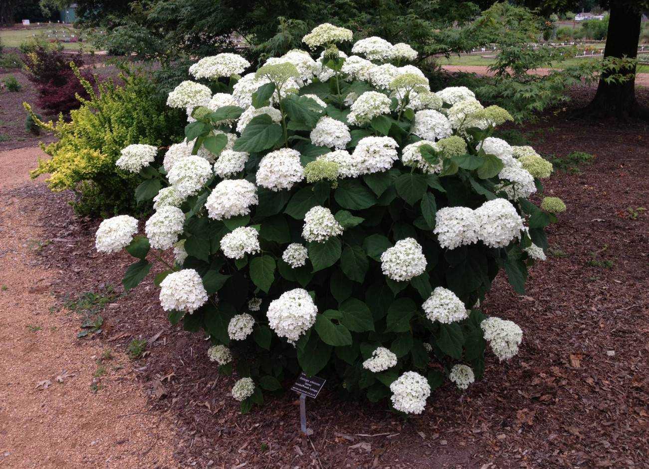 - Древовидная. Кусты высотой от 1,5 до 3 м имеют щитовидные соцветия диаметром 15–20 см белого и кремового оттенка. Зимостойкие сорта, цветут с июля по октябрь.