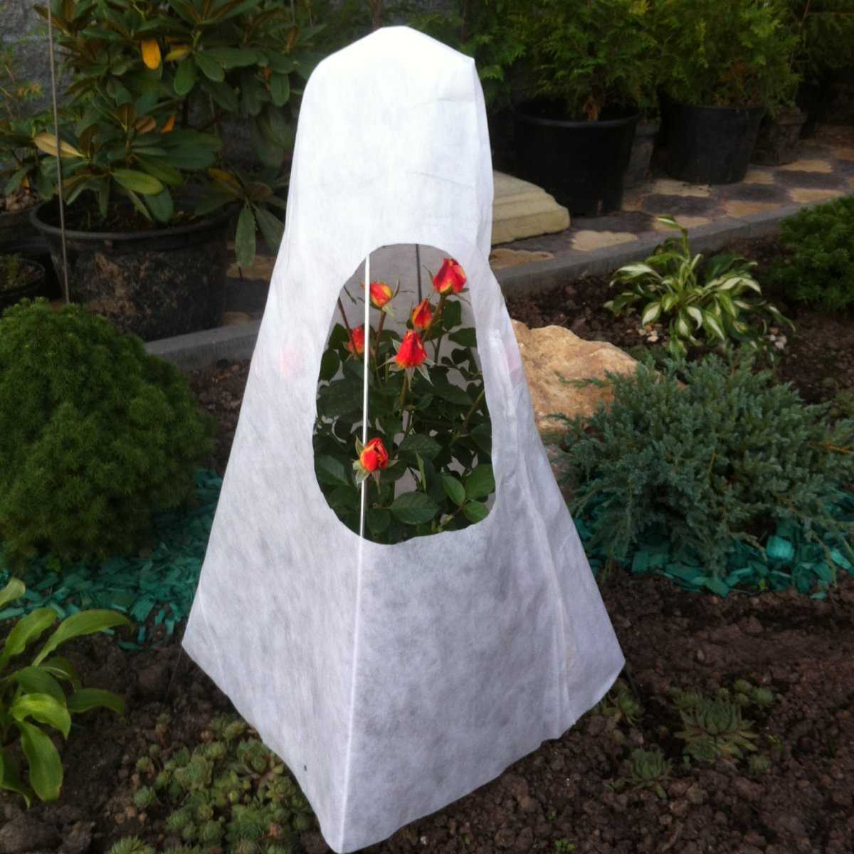 - Когда температура опускается ниже нуля, удаляют все листья и укрывают куст. Для этого создают каркас из проволоки, на котором фиксируют несколько слоев укрывного материала. Нижний край оставляют приоткрытым до наступления устойчивых морозов. Рекомендуется в теплую погоду приподнимать низ укрытия для доступа воздуха.