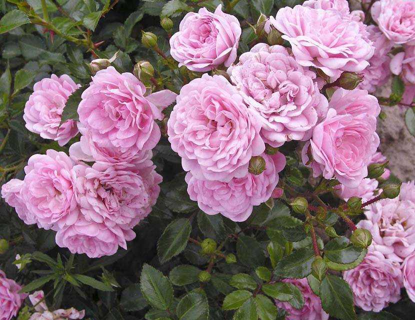 - Роза Хансаланд (Ханса) — один из наиболее популярных сортов. Бутоны красивые, продолговатые. Цветки сиреневые расположены по 3-5 шт. в кистевидных соцветиях. Плоды мелкие, внешне схожи с помидорами-черри. Роза Hansaland цветет всё лето и осень до начала заморозков.