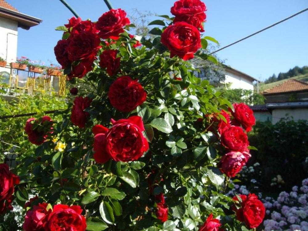 - Аджимушкай. Эти розы были выведены в Крыму. Плетистая роза, достигающая 3 метров в высоту. Имеет крупные, пышные, красные бутоны в диаметре до 13 см. Сорт подойдёт для декорирования участка, дома, стен, опор.