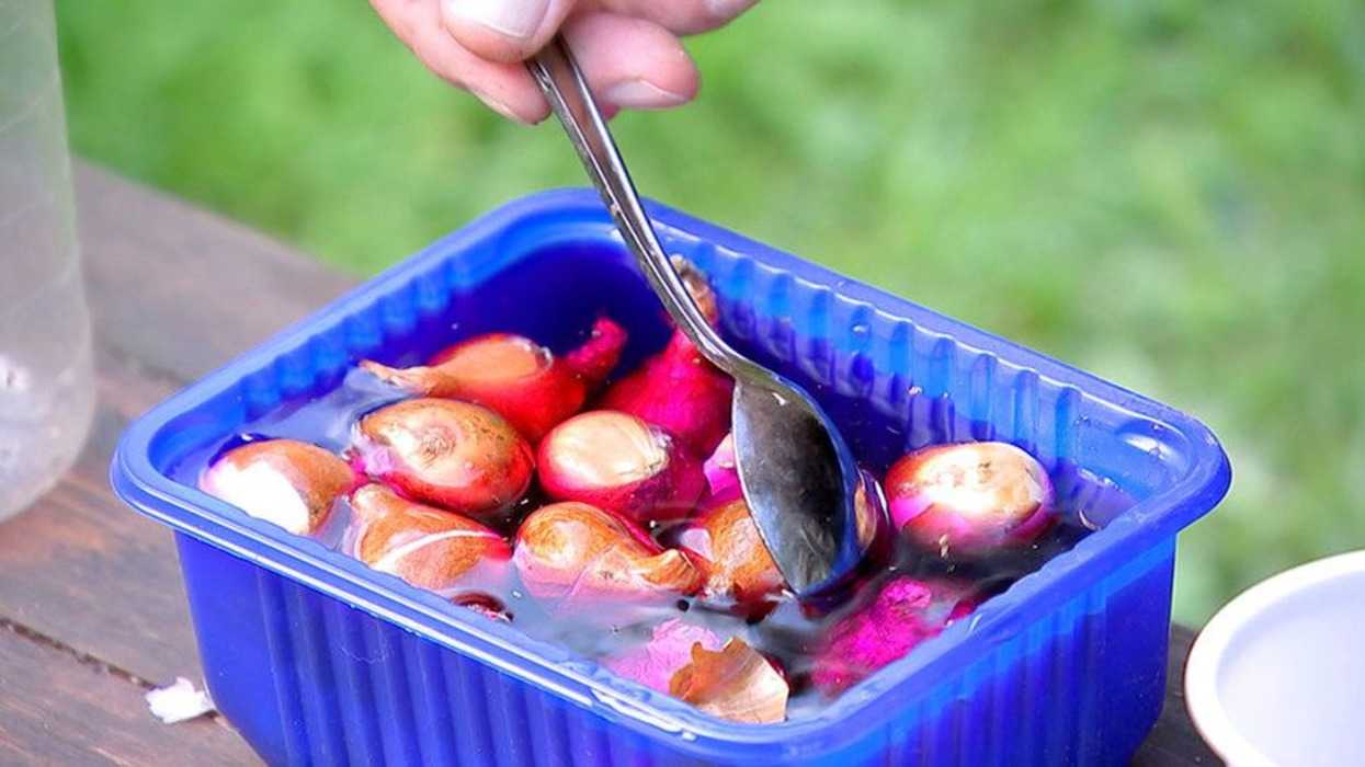 Рисунок 4. Обработка луковиц марганцовкой перед посадкой