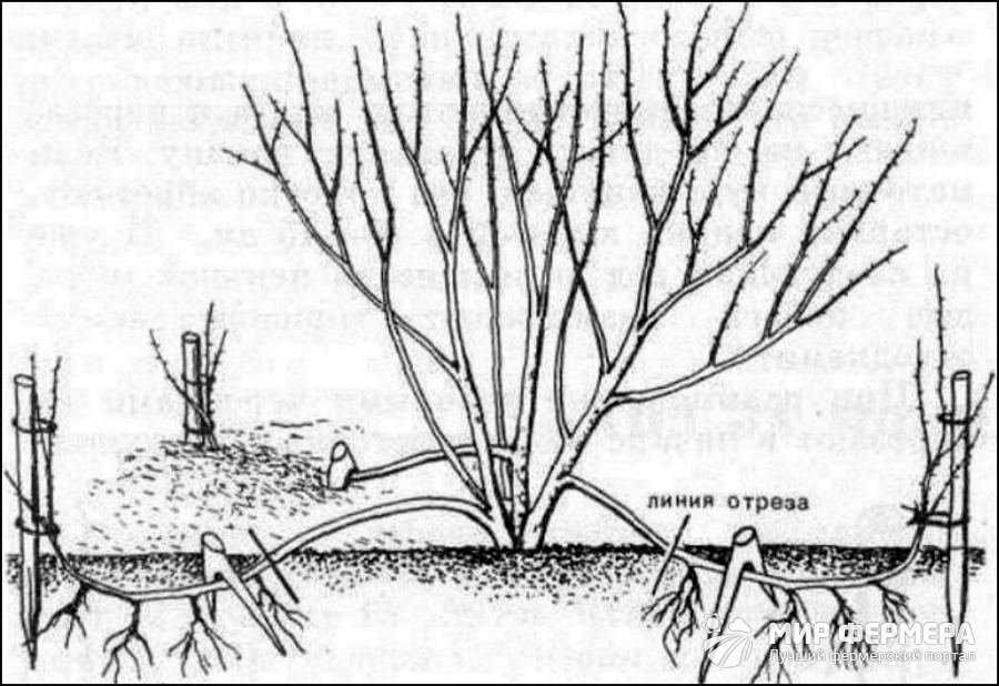 Размножение корневой порослью (отводами) также считается эффективным методом получения качественного посадочного материала. Для этого весной нужно выбрать молодой побег, который еще не успел одревеснеть, и перетянуть его медной проволокой у основания и на расстоянии 80 см.