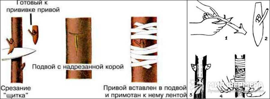 До начала прививки проводят обильный полив в течение 5-6 дней, а перед процедурой тщательно протирают место крепления почки влажной чистой тканью. На подвое на уровне 3-5 см от уровня земли делают Т-образный разрез длиной до 3 см, аккуратно приподнимают кору и вставляют в образовавшееся отверстие почку или черенок. После этого ветку нужно аккуратно перемотать изолентой или пленкой для фиксации.