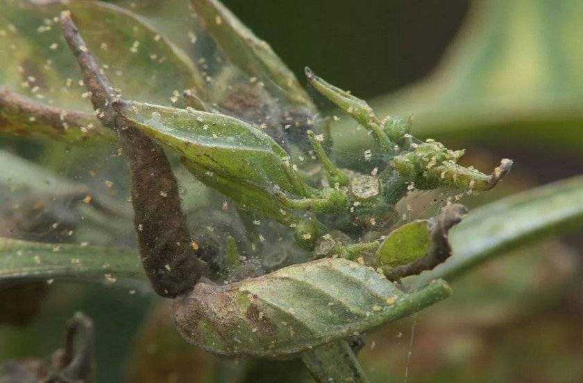 - Осмотрите листок растения на оборотной стороне и междоузлия, наличие тончайших нитей свидетельства о том, что завелся паутинный клещ. Появляется он при очень сухом воздухе.