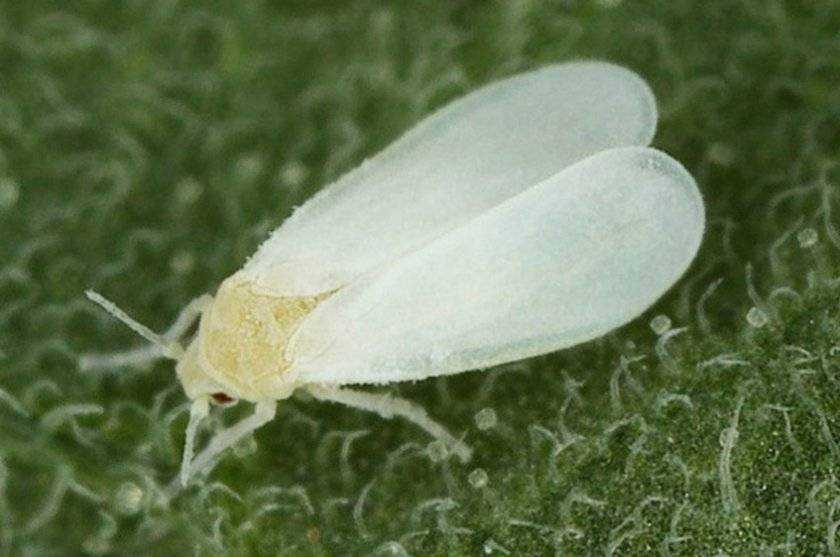 - Бабочка-белокрылка – питается соками растения, уничтожает листки.