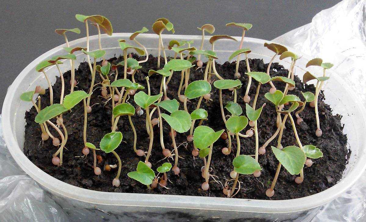 Важно! Главное, не забывать регулярно увлажнять землю и проветривать. Первые всходы проклюнутся на 30-40 сутки. С появлением сеянцев укрытие убирают и обеспечивают комфортную температуру 18-19 °С. По мере появления 2-3 настоящих листочков производят пикировку, а клубеньки присыпают землей. Через полгода полноценное растение можно пересаживать в отдельный горшок, клубень помещают в почву лишь на 2/3, чтобы верхушка находилась немного выше уровня земли