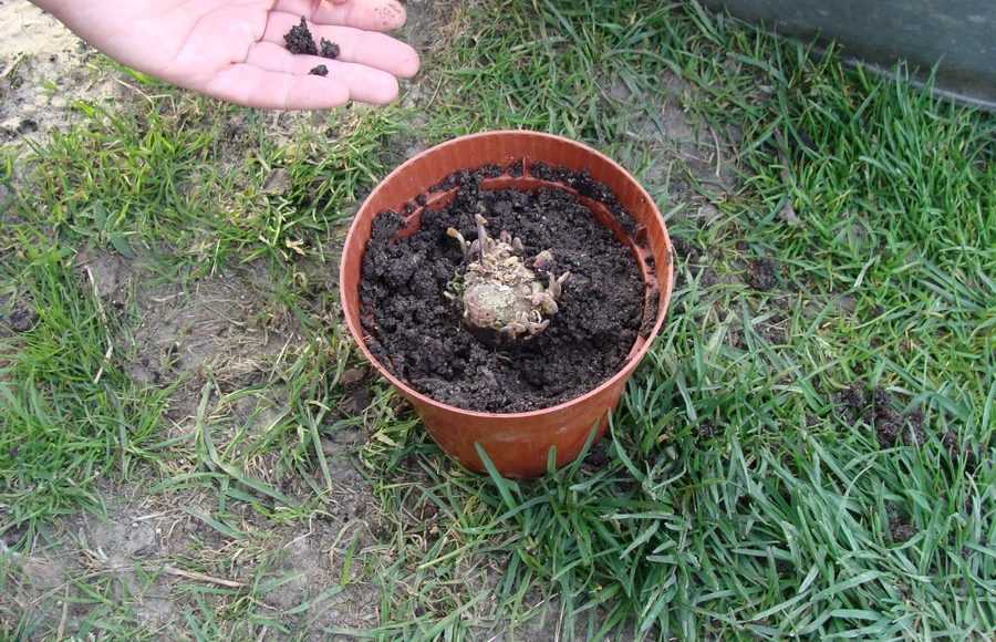 Пересадку проводят ежегодно в августе либо сентябре, а делают это после того, как из клубня покажется первая листва. Емкость для пересадки выбирают широкую, а наполняют ее рыхлым субстратом с рН 5,5–6. Примерный состав почвосмеси: перегной, песок и торф (по одной части), а еще листовая почва (2 либо 3 части). Еще можно использовать субстрат следующего состава: песок, перегнойная и листовая почва (1:2:4). Если рН почвосмеси выше 6,5, тогда повышается вероятность того, что растение будет поражено грибковыми заболеваниями.