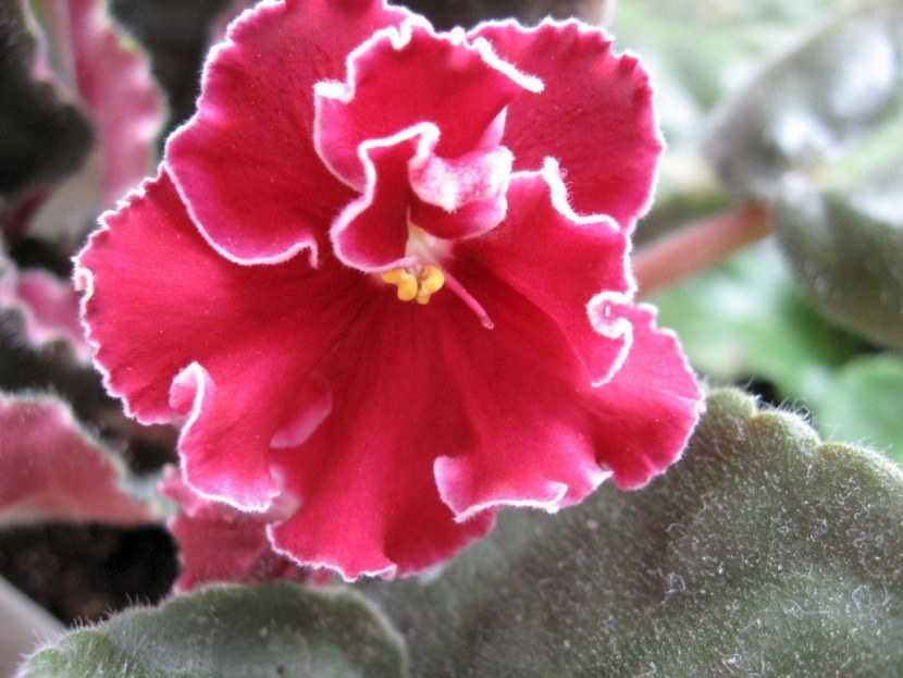 Rob`s Love Bite. На стеблях (средней длины) этой фиалки имеются красные (тёмный оттенок) или малиновые соцветия. «Цвет любви» присущ и листве, которую он покрывает с тыльной стороны. Период цветения длится около 2х недель.