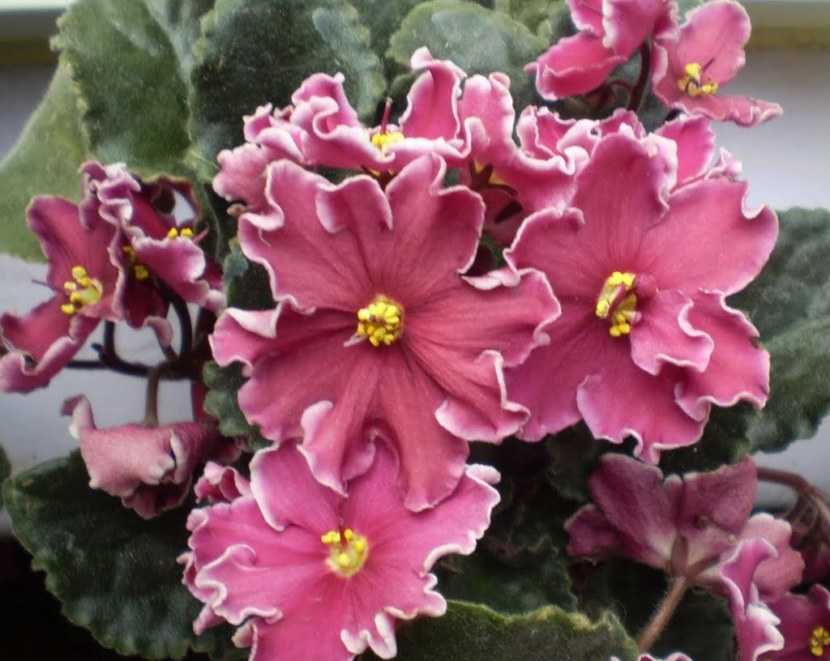 - Rob`s Dust Storm. Крупные розовые фиалки, покрытые каплевидными синими точками. Они имеют тёмно-зеленую листву с крупными зубцами. Достаточно нескольких кустов для создания неповторимой цветущей атмосферы как на клумбе, так и в комнате.