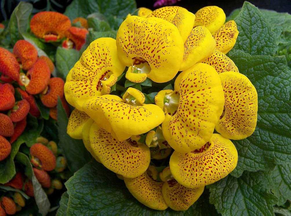 Кальцеолярия относится к любимым весенним красивоцветущим растениям, хотя в комнатных условиях ее выращивать и разводить довольно сложно (растение предпочитает прохладные помещения). Цветки кальцеолярии очень своеобразные по форме — пузырчатые и двугубые (нижняя губа крупная, вздутая, шаровидная, а верхняя — чрезвычайно маленькая, еле заметная). Цветки нередко покрыты разнообразными пятнами, точками. Период цветения длится с марта по июнь в течение одного месяца. На растении бывает от 18 до 55 цветков.